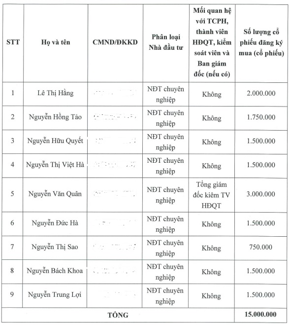 Danh sách đăng ký mua có 9 nhà đầu tư. Trong đó, Tổng Giám đốc kiêm Thành viên HĐQT Nguyễn Văn Quân dự kiến mua nhiều nhất với 3 triệu cp; tiếp theo là 2 nhà đầu tư cá nhân – bà Lê Thị Hằng dự kiến mua 2 triệu cp và ông Nguyễn Hồng Tảo dự kiến mua 1.75 triệu cp.